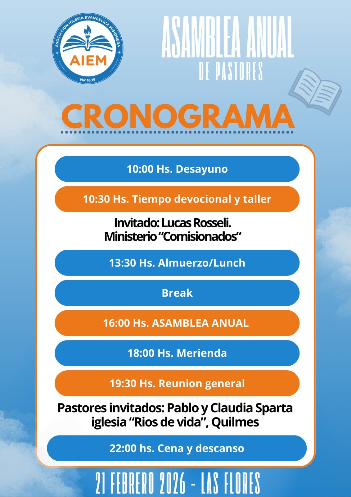 La Asociación Iglesia Evangélica Misionera (AIEM) llevará adelante su Asamblea Anual de Pastores el próximo 21 de febrero de 2026, en la ciudad de Las Flores, teniendo como sede anfitriona a la iglesia “Conectados con el Cielo”.